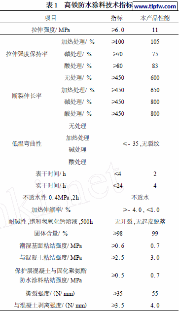 综合以上实验规律,得到高铁用聚氨酯防水涂料,可满足2007 年《客运专线桥梁混凝土桥面防水层暂行技术条件》中对聚氨酯防水涂料的要求,达到如下表的技术指标,现将本产品性能与指标列于下表中。