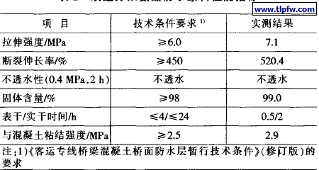 该MDI型高强度双组分聚氨酯防水涂料通过实验室检测,各项指标完全能满足高速铁路桥面防水层设计要求。由于采用了毒性较小的MDI制备预聚体,不添加再生橡胶和煤焦油,且不使用任何溶剂,有利于环境保护和工人健康。
