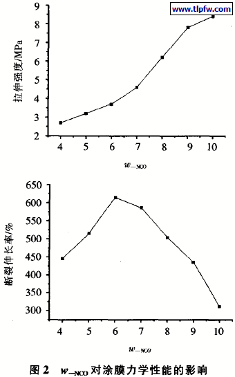 预聚体A组分中异氰酸酯(一NC0)的质量分数是影响聚氨酯防水涂料力学性能的关键因素,通过对预聚体中一NC0质量分数( w-nco)的调整,可以改善聚氨酯防水涂料的力学性能。实验结果表明(见图2),随着 w-nco的提高,涂膜机械强度明显提高。但是同时也会造成涂膜的弹性和柔韧性降低,以致延伸率下降。可以根据不同设计要求来选择合适的w-nco。