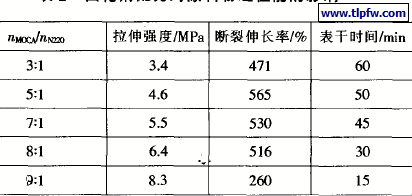 以MOCA和聚醚三元醇N220作为高强度聚氨酯防水涂料的固化剂,研究了这两种固化材料对聚氨酯涂料物理性能的影响,结果见表2。