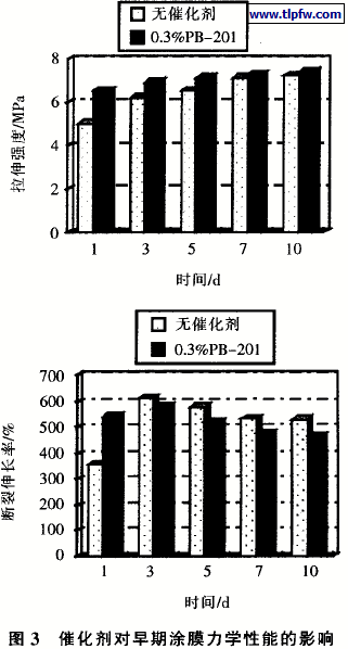 从图3看出,催化剂PB一201使聚氨酯涂料的早期拉伸强度明显提高,但是由于催化剂的加入加速了聚氨酯涂料的固化。使表干时间缩短,从而降低聚氨酯涂膜的延展性,断裂伸长率下降。