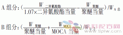聚醚220、聚醚3050、聚醚330N,工业级,上海高桥石化公司;甲苯二异氰酸酯、二苯基甲烷二异氰酸酯,工业级,进口;3,3'-二氯-4,4'-二氨基二苯基甲烷(MOCA)、邻苯二甲酸二丁酯、氯化石蜡、消泡剂,工业级,上海台安工程实业有限公司;辛酸亚锡,工业级,上海诺泰化工有限公司;滑石粉,工业级,上海双达化工有限公司。