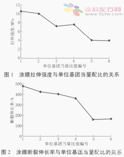 试验结果表明,当A 组分的单位基团当量与B 组分等当量时所测得的拉伸强度和断裂伸长率要优于B 组分单位基团当量过量时。而当A 组分的单位基团当量相对于B 组分略微过量时拉伸性能更佳。
