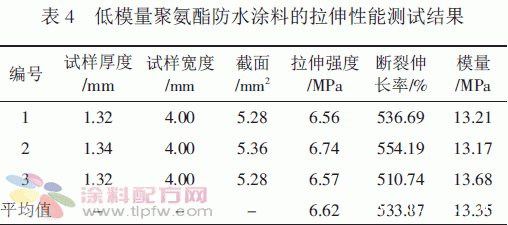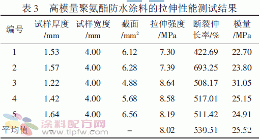 所研制的典型高强度聚氨酯防水涂料由上海市建筑材料及构件质量监督检测站测试,性能及其与标准对比见表6。