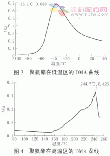 高强度聚氨酯防水涂料配方设计中最重要的是A 组分中聚氨酯树脂的结构,为此,对配制的聚氨酯防水涂膜进行了低温区与高温区的DMA 分析,结果如图3、图4 所示。