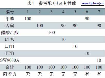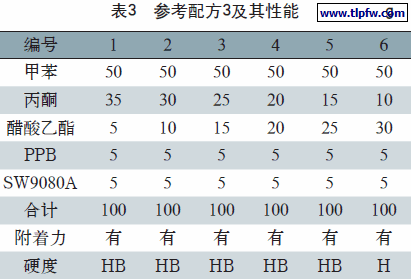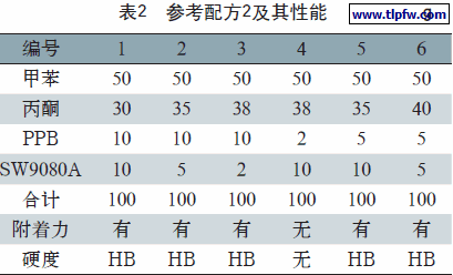 通过选用A B S塑料用U V清漆附着促进剂品种及配方设计过程,认为采用P P B和S W9080A品种,用量为附着促进剂溶剂中各5%是合适的,既解决附着力问题,又确保涂膜硬度达到H级。