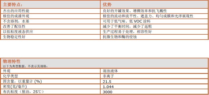 平性、均匀的成膜性能、光泽展现性和高增稠效率。此产品是为低气味、低VOC 的非溶剂型涂料设计的,而且也能用于其它乳液