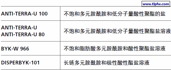 这些助剂通过空间位阻使颜料解絮凝。由于解絮凝的颜料颗粒很小,从而可获得高光泽、增进颜色强度。此外,增加了透明度和遮盖力。这些产品降低粘度,因而改进了流平性,并能提高颜料的含量。