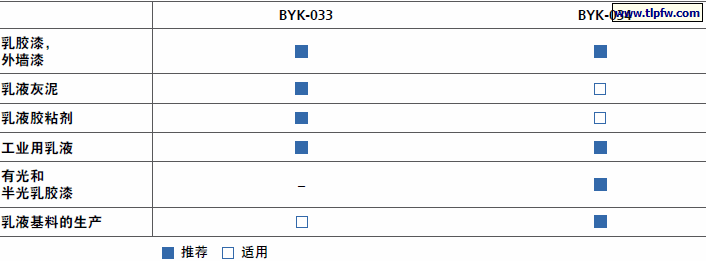 BYK-033 广泛用于颜料体积浓度为 35-70 的乳胶体系。BYK-033 不含有机硅。