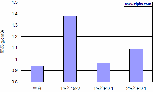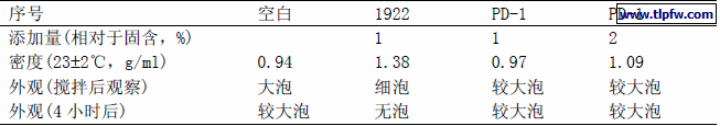 评价方法:以上配方添加消泡剂后在2000 rpm 下分散2 min 后,用比重杯测密度。
