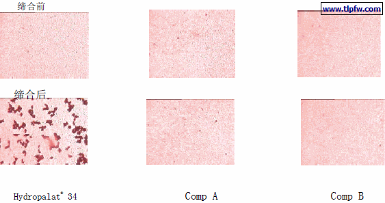 Hydropalat® 34 与缔合型增稠剂DSX3551 的缔合作用为75%的R-706 研磨分散浆,使用Hydropalat® 34、Comp A,Comp B 疏水分散剂分散,加入缔合型增稠剂DSX3551 缔合,在100倍显微镜下得到照片。 Hydropalat® 34 分散的研磨浆体颗粒间有明显的缔合。