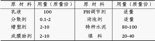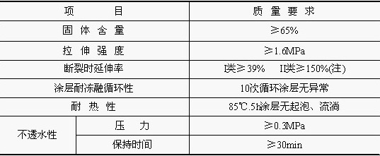 注:按其聚灰比不同分为I类、II类。I类适用于地下室、厕浴间、水池等防水工程;II类适用于工业与民用建筑屋面、外墙等防水工程。本表摘自福建省宁德市建工防水材料工程有限公司企标Q/NDJF01-2001《聚合物水泥复合弹性防水涂料》。