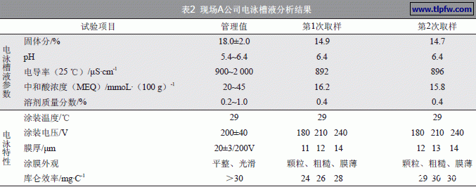 对现场A公司电泳漆槽液进行常规全检,结果见表2。