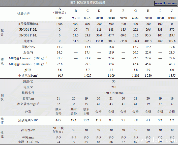 调整A公司电泳槽液参数至工艺范围,再向槽液中加入B公司的POWERNICS 301电泳漆,补加比例为F-1(色浆):F-2(乳液)=1:3.0,并分别在POWERNICS301电泳漆的置换率为10%、20%、30%、40%、50%、60%、80%、90%、100%的时候,通过挂板试验进行检测,结果见表3。从表2和表3的试验结果看,现场原A公司电泳槽液的各项性能参数基本偏于工艺范围的下限值,有些甚至已不在工艺范围内,漆膜外观也不能满足要求。经调整后,槽液性能和漆膜性能基本满足要求。随着POWERNICS 301置换量的不断添加,槽液的各项参数、槽液性能和涂膜性能等变化稳定,且随着POWERNICS 301混槽比例的增大,涂膜性能逐步达到了POWERNICS301的水平。混槽试验过程中没有出现异常情况,槽液稳定,涂料的施工性能良好,涂膜的各项性能指标都有所提高,故混槽切换可行。
