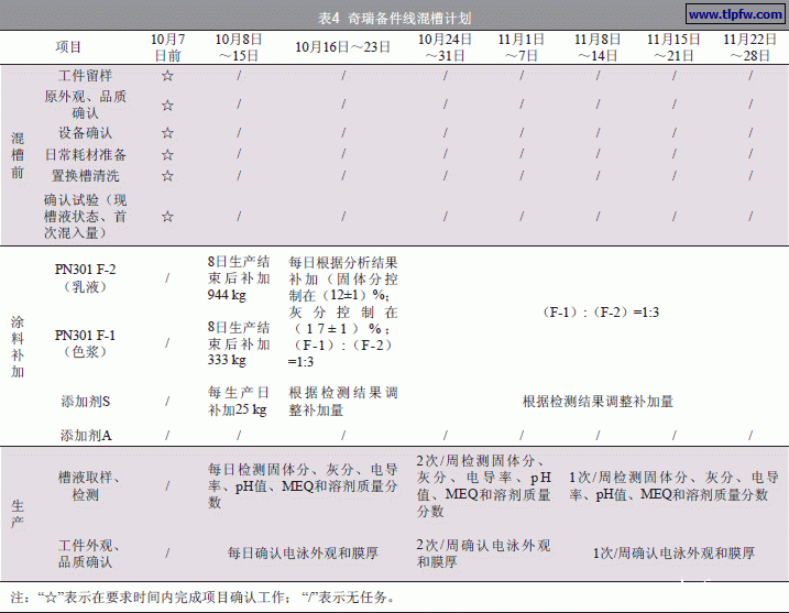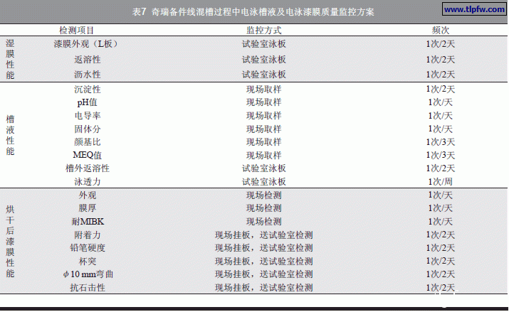 (2)混槽期间,提高槽液的检测频次以及槽液性能和漆膜性能的检验频次,监控方案见表7。