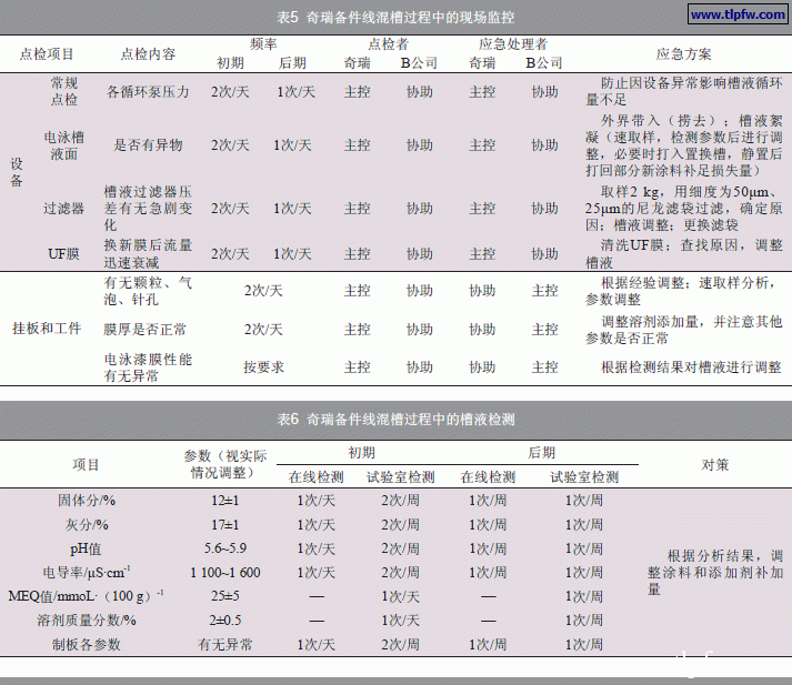 (1)混槽期间加强对现场的管理,每班次对槽液常规参数进行检测、观察涂膜外观、记录涂膜厚度,并制定了详细的应急方案(见表5、表6)。