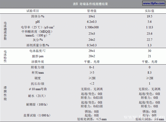 混入POWERNICS 301电泳漆以后,电泳槽液及工件漆膜的各项性能指标都呈现上升趋势,历时6个月的时间,备件生产线完成了电泳漆的切换工作。在混槽期间,备件线的生产和质量都相当稳定,并无异常问题发生(见表8)。