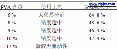 表3 PVA 含量对PU 乳液的使用工艺及表观吸水率的影响