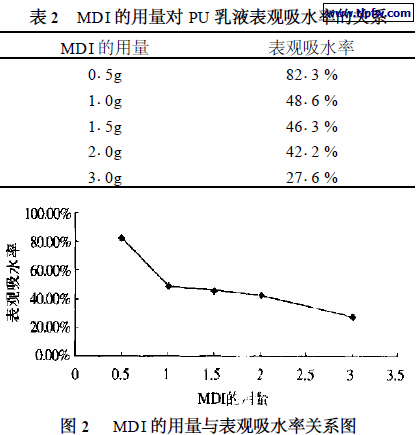从上述实验结果可知, 当MDI 的用量为1.5g 时, 可以制得粘度、表观吸水率及使用工艺等综合性能优异的PU 乳液.
