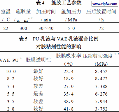 我们选用PVA 的含量为9 % , MDI 的加入量为1.5g 的PU 乳液与VAE 乳液混配并进行改性研究. 按图1 和表4 所示的工艺参数制样, 现将各项实验结果列入表5.