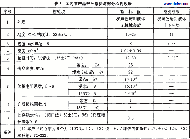 国内某产品部分指标与部分检测数据如表2所示。